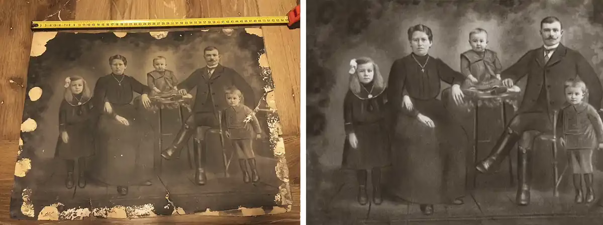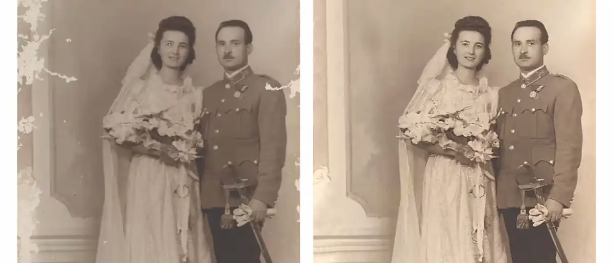 - Szakadt, lyukas vagy hiányos a fotó? Digitálisan kipótoljuk a hiányzó részeket, eltávolítjuk a foltokat, karcolásokat, és visszaadjuk az eredeti hangulatot.
