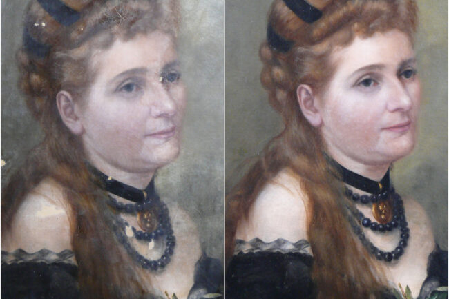 Pattogzó képek konzerválása, szakadások javítása, hiányzó részek pótlása, szennyeződések eltávolítása, lakkréteg tisztítása, újralakkozás, dublírozás, újrafeszítés.