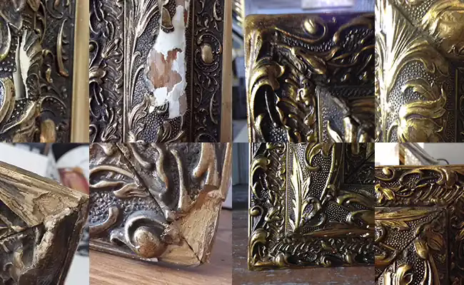 Képkeretek tisztítása, frissítése, hibák javítása, hiányok pótlása, konzerválás, felületkezelés, festés, aranyozás, patinázás: restaurálás.